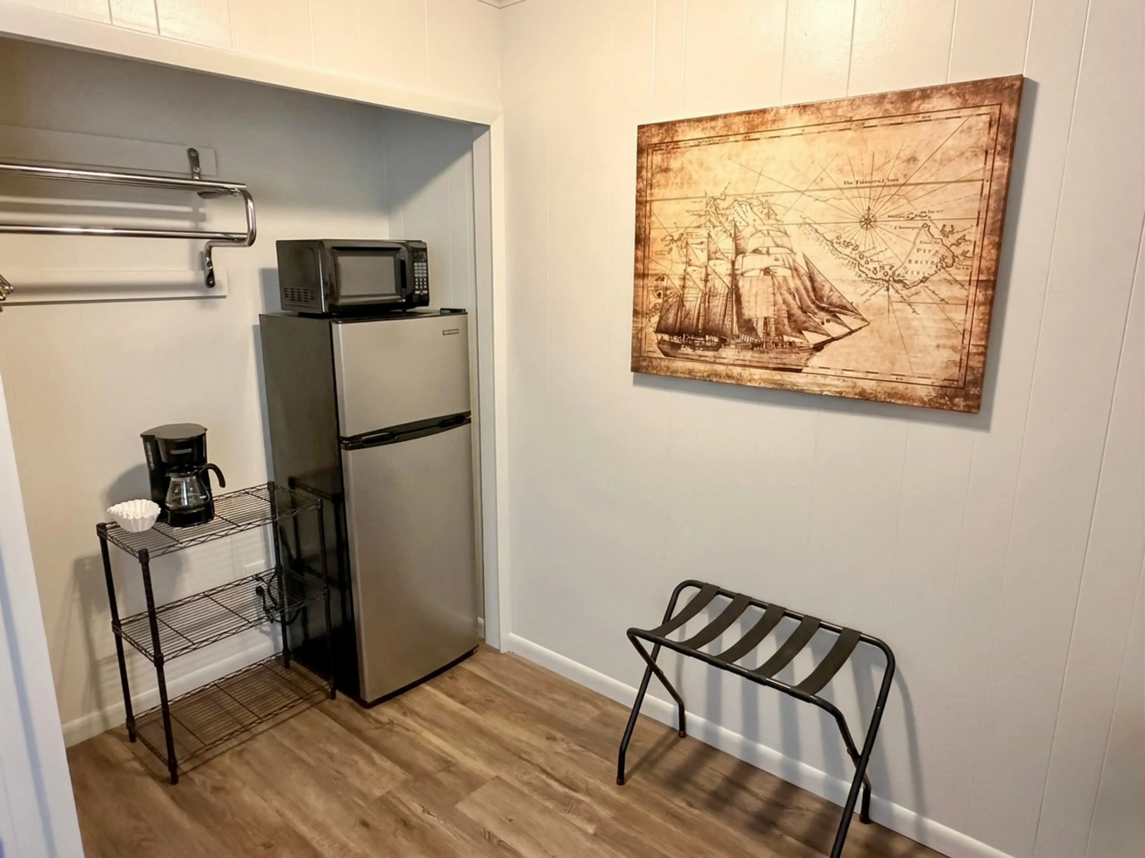 Command the room. A large vintage map serves as the headboard, setting the course for a bold nautical retreat. The Captain's Room features nautical rope drawer pulls, a porthole mirror, a brass hook rack, and a ship's lantern sconce — designed for couples or small groups who appreciate a room with c...